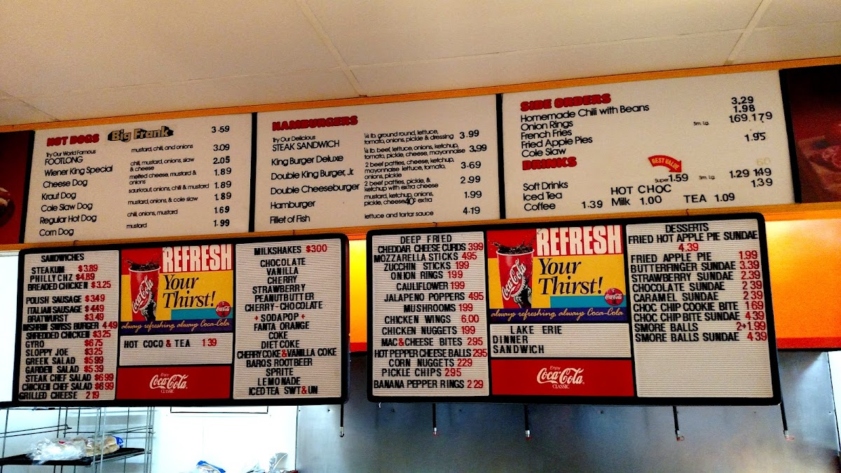 Welcome to Wiener King, a beloved eatery located at 118 Lexington Ave, Mansfield, OH, where nostalgia meets delectable comfort food. Our menu boasts an array of tantalizing options, prominently featuring our World Famous Footlong Hot Dogs, available with savory mustard, chili, and onions for just $2.79. For burger lovers, the King Burger Deluxe is a must-try, priced at $3.59 and packed with juicy beef and fresh toppings.